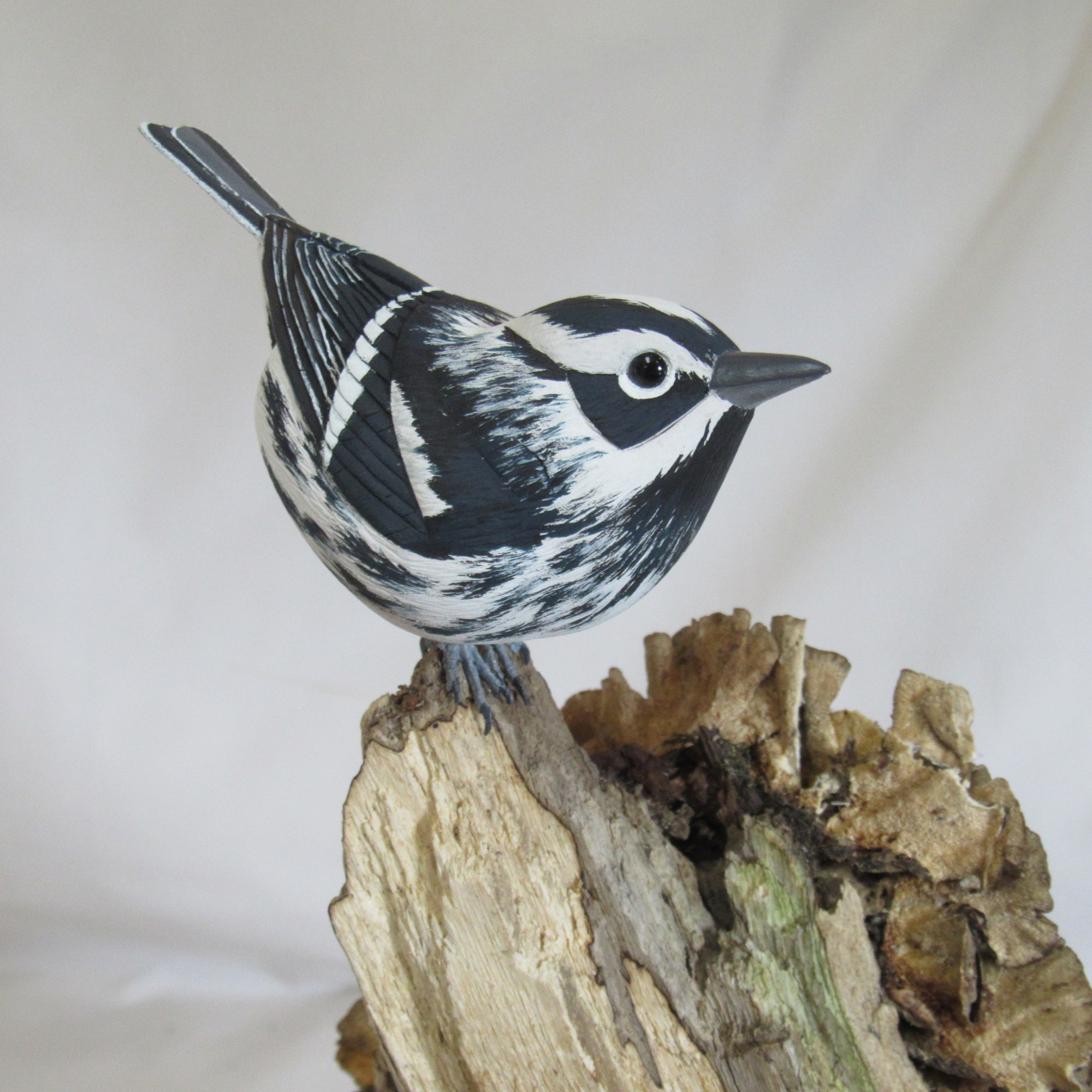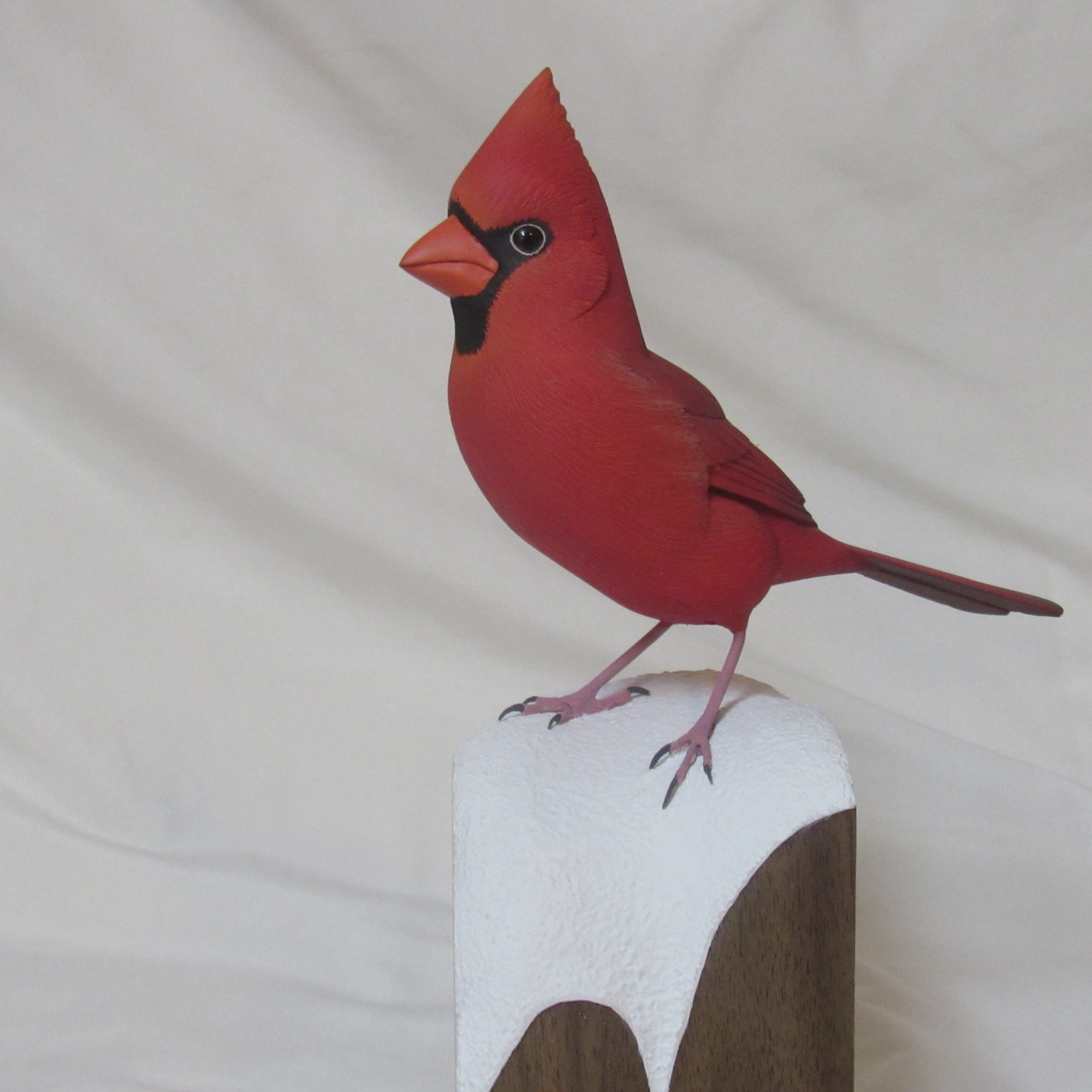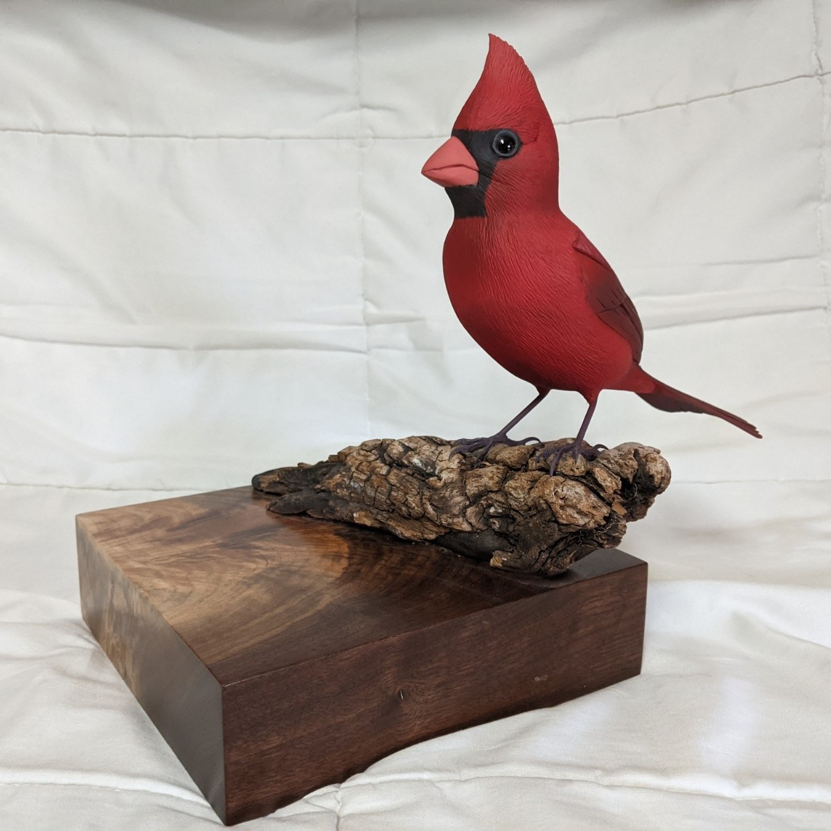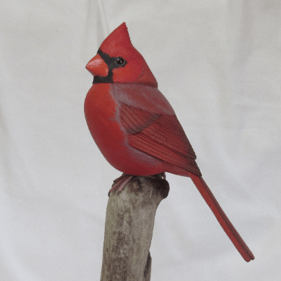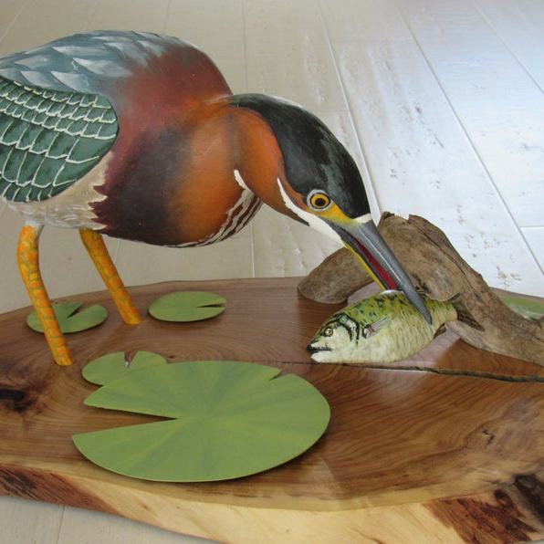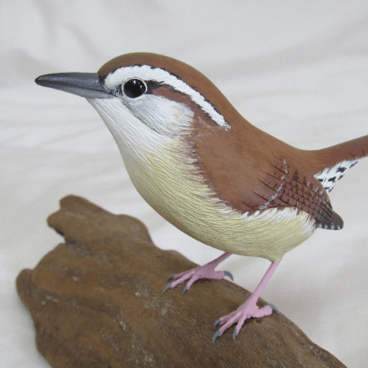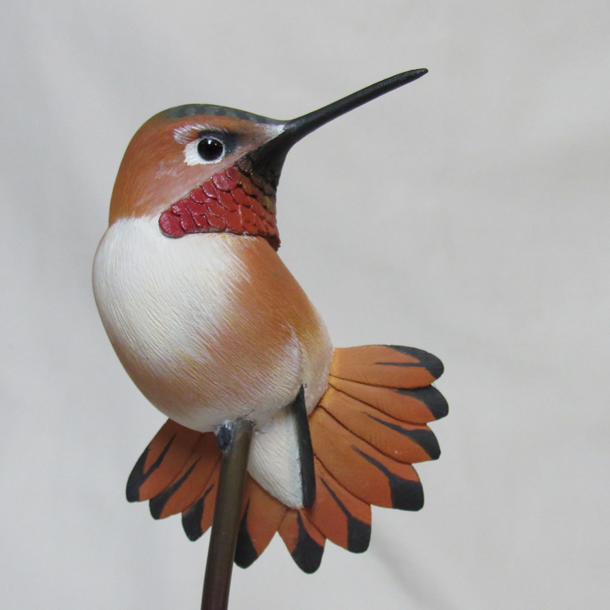 All carvings are roughed out by hand, then detailed with a power carver. After the bird and been detailed, then a wood burner is used to detail feathers. After all detailing, the bird is airbrushed and then hand painted.