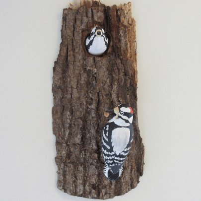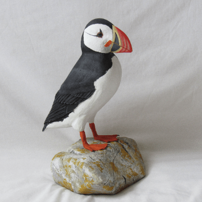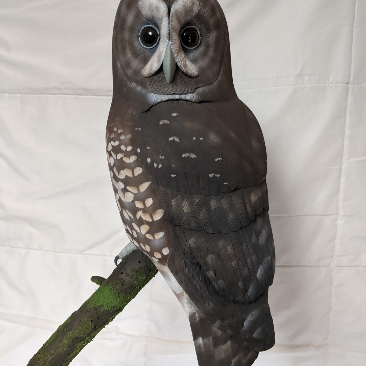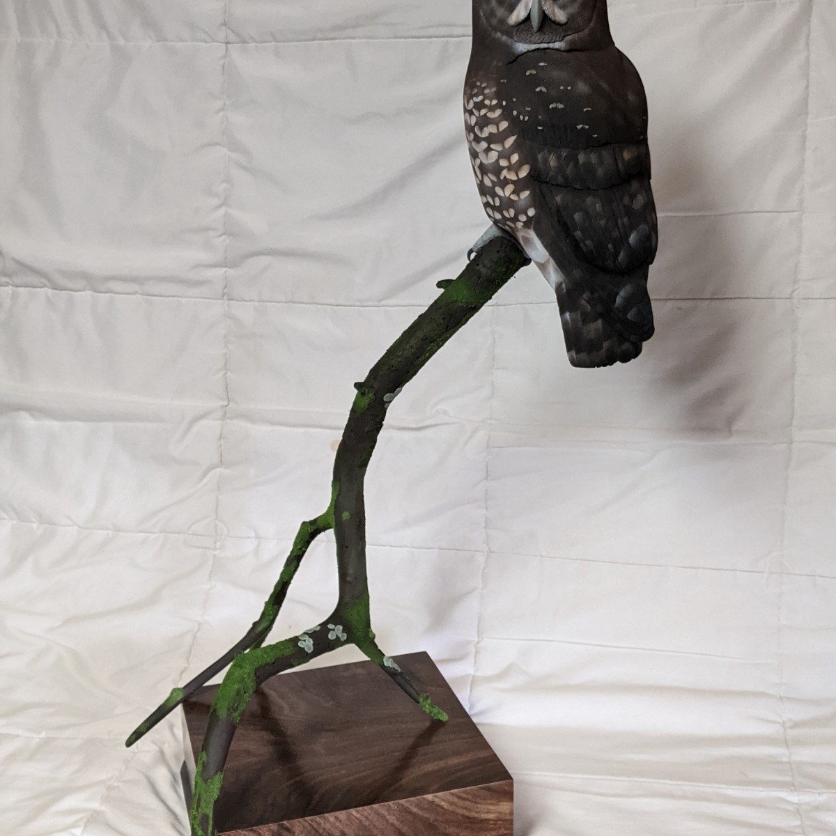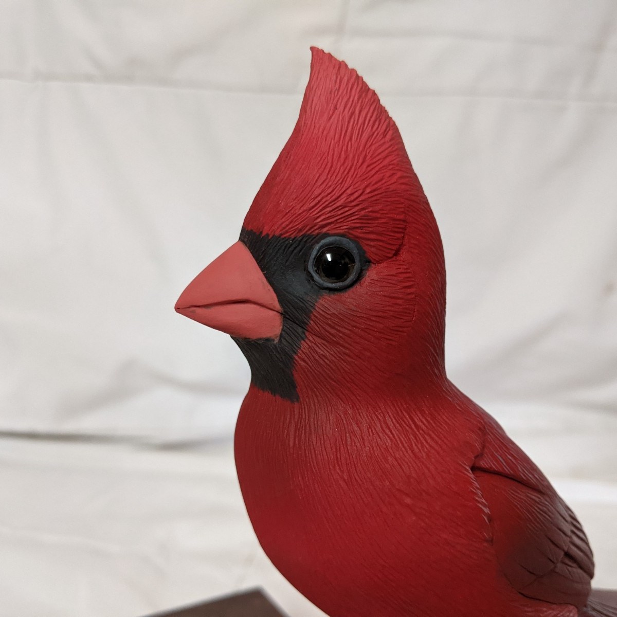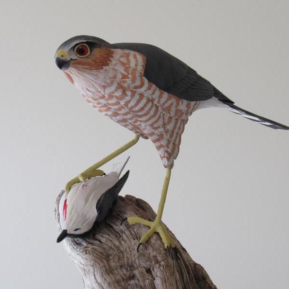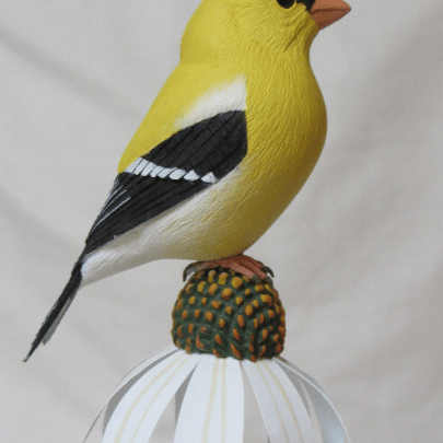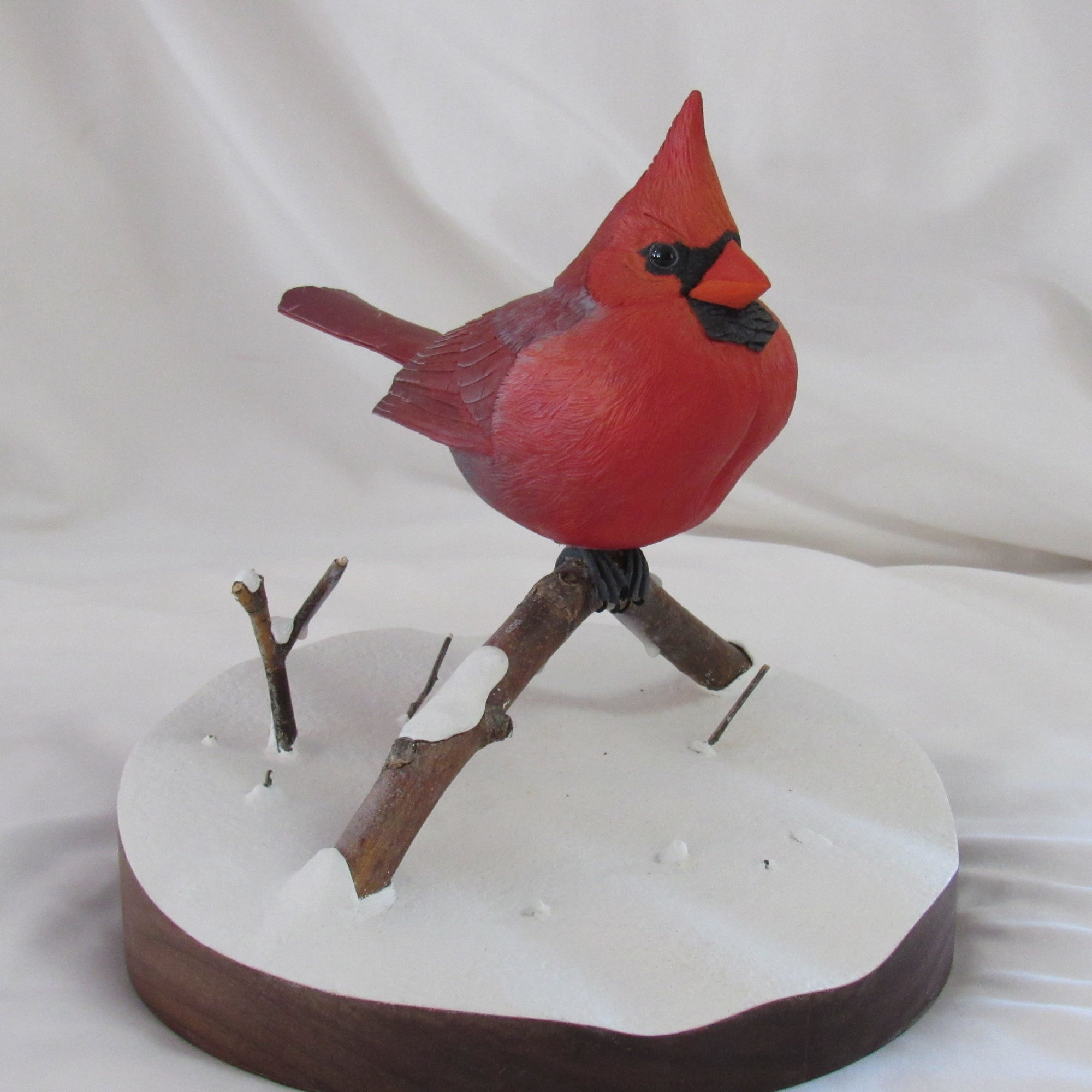 All carvings are roughed out by hand, then detailed with a power carver. After the bird and been detailed, then a wood burner is used to detail feathers. After all detailing, the bird is airbrushed and then hand painted.