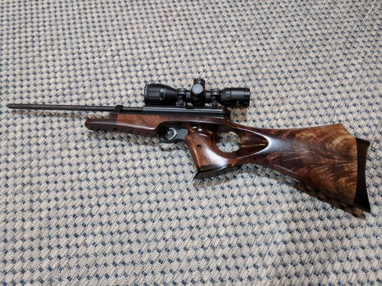Custom fit and hand carved wooden gunstock. Black stained “recoil pad”. This pellet gun was used as an example of the possibilities when it comes to customized stocks.